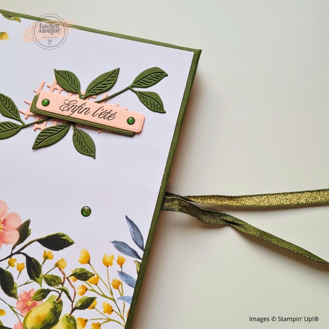 Les teintes Feuillage Sauvage et Pétale Rose se marient à merveille pour une ambiance naturelle et lumineuse. Un ruban coordonné, subtilement pailleté de doré, vient parfaire l’ensemble. La couverture rigide est décorée avec soin, agrémentée de feuillages découpés, de perles scintillantes et d’une étiquette poétique “Enfin l’été” – une invitation à profiter de l’instant présent.