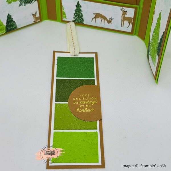 ➡️ À droite, une pochette contient un joli tag qui peut aussi servir de marque-page. Le message inscrit dessus rappelle la magie des fêtes : “Pour une saison de partage et de bonheur”.