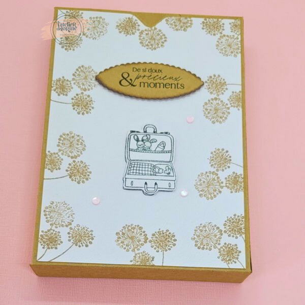 Ce coffret est conçu en papier kraft, rehaussé de doux tons rose pastel et blanc. Chaque carte est unique, décorée à la main avec des tampons choisis aléatoirement. Un adorable doudou est mis en valeur sur chaque modèle, colorisé avec la technique de l’aquarelle.