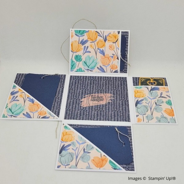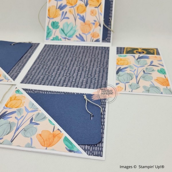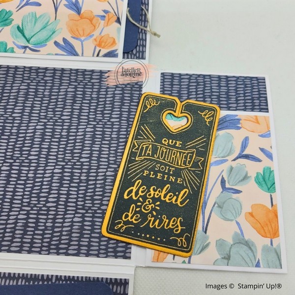 Les trois premiers rabats contiennent chacun une pochette avec un tag. Chaque tag peut accueillir deux photos au format 5×7,5 cm. Le quatrième rabat renferme une pochette avec un tag décoré. Celui-ci porte un joli message tamponné : « Que ta journée soit pleine de soleil et de rires ».