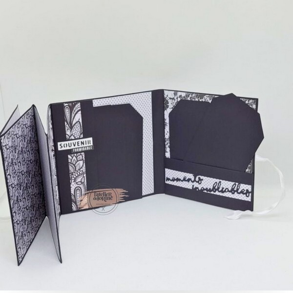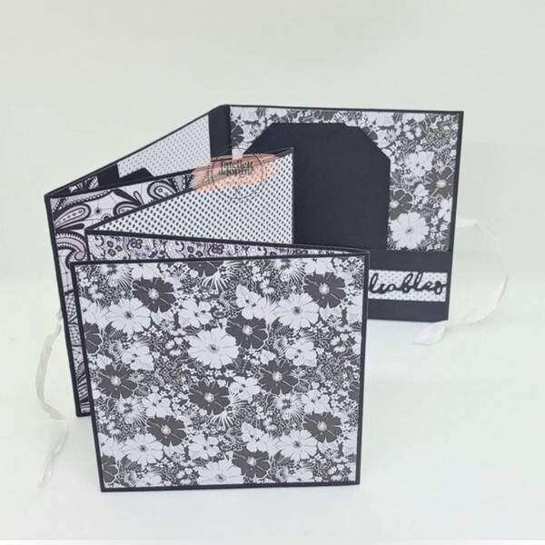Conçu dans un format carré compact (13,5 × 13,5 cm), cet album séduit par son design épuré. Sa couverture souple associe des papiers graphiques en noir et blanc, aux motifs floraux et géométriques. Le contraste délicat de ces imprimés apporte une touche de modernité, tandis que le ruban blanc assure une finition soignée et élégante.